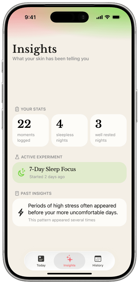 Log moments like hot showers, food, and stress in under 10 seconds. Dermy connects the dots for you.